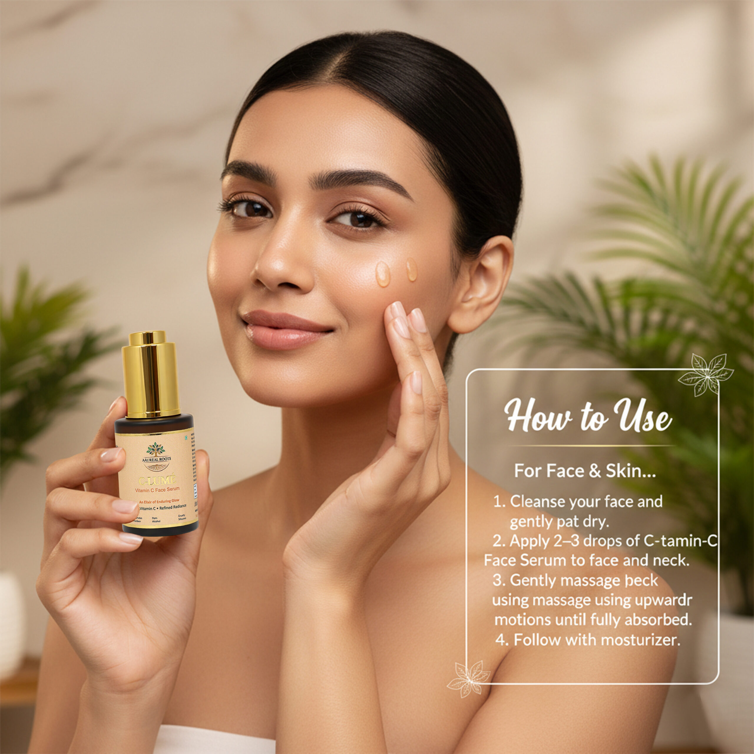 2. Apply 2–3 drops of C-Lume Vitamin-C Face Serum to face and neck.
