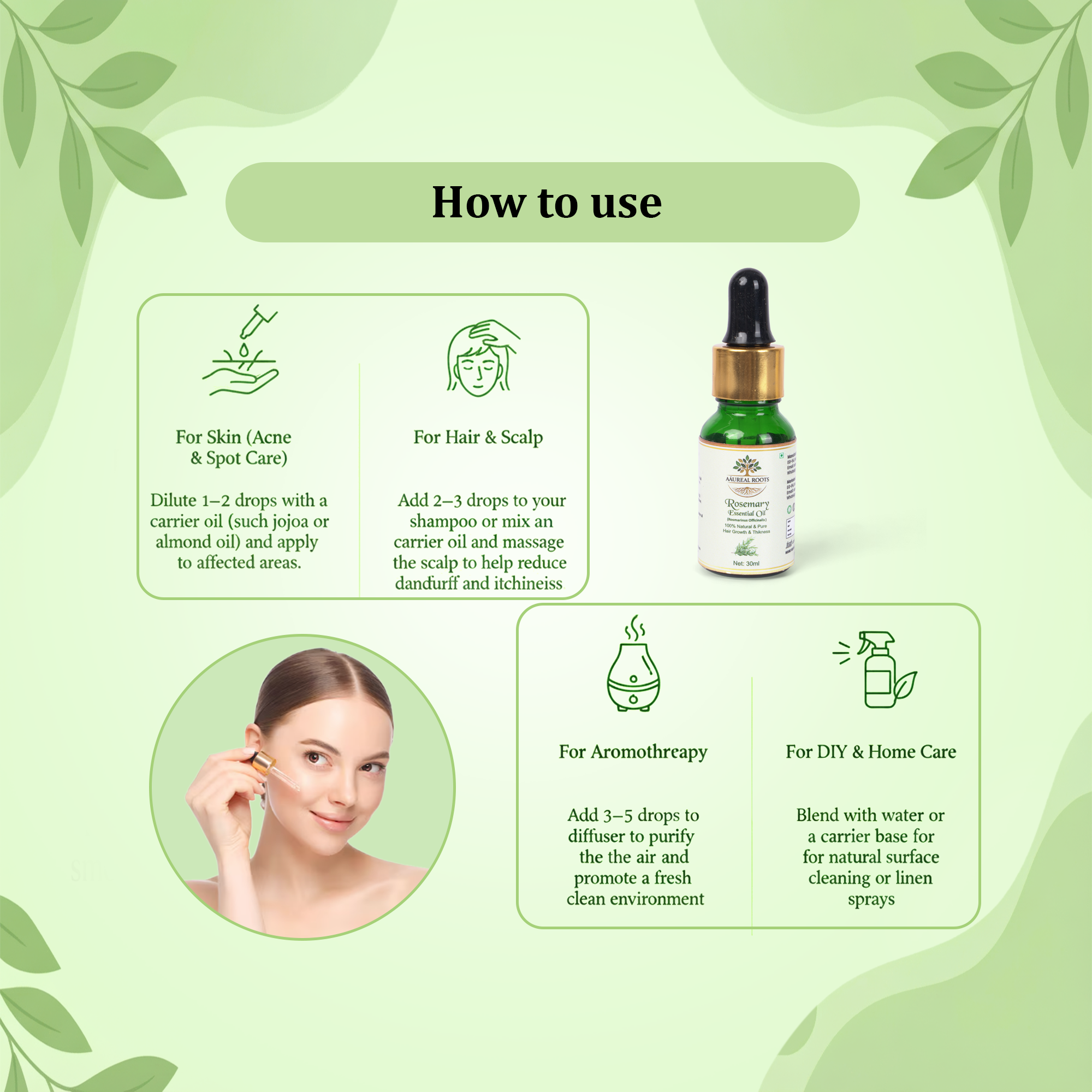 • Mix 2–3 drops with a carrier oil (coconut, jojoba, or castor oil).