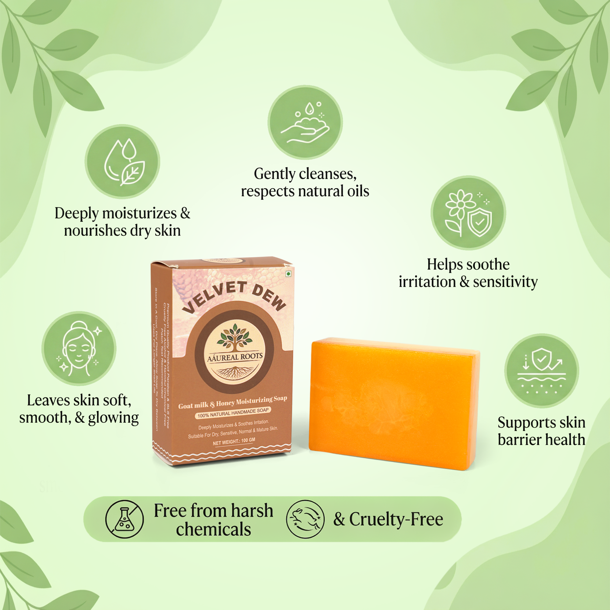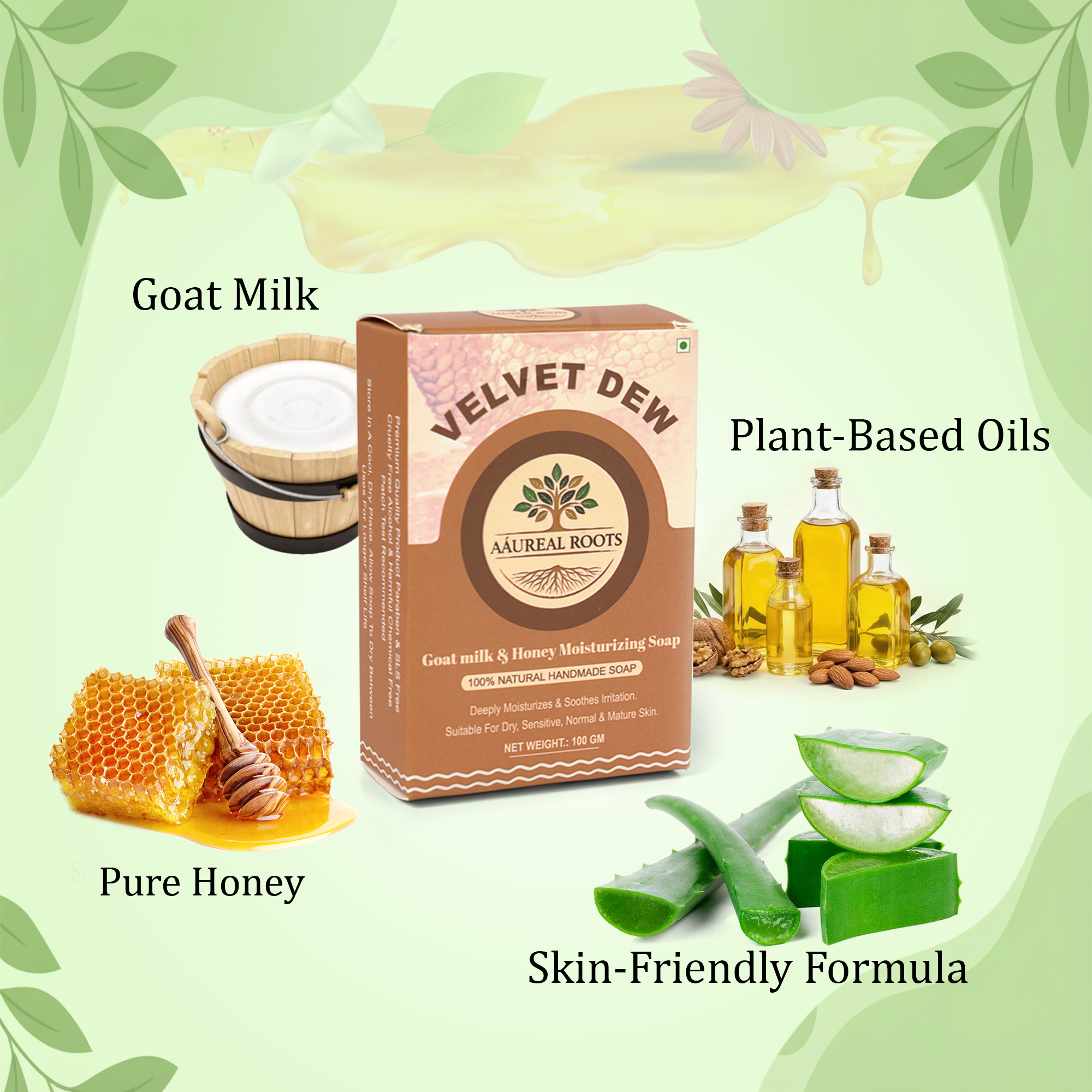 Aáureal Roots Velvet Dew™ Moisturizing Soap is a thoughtfully crafted, skin-loving bathing bar designed for everyday indulgence. Powered by the nourishing richness of fresh goat milk and the humectant magic of natural honey, this soap helps maintain the skin’s moisture balance while cleansing gently.