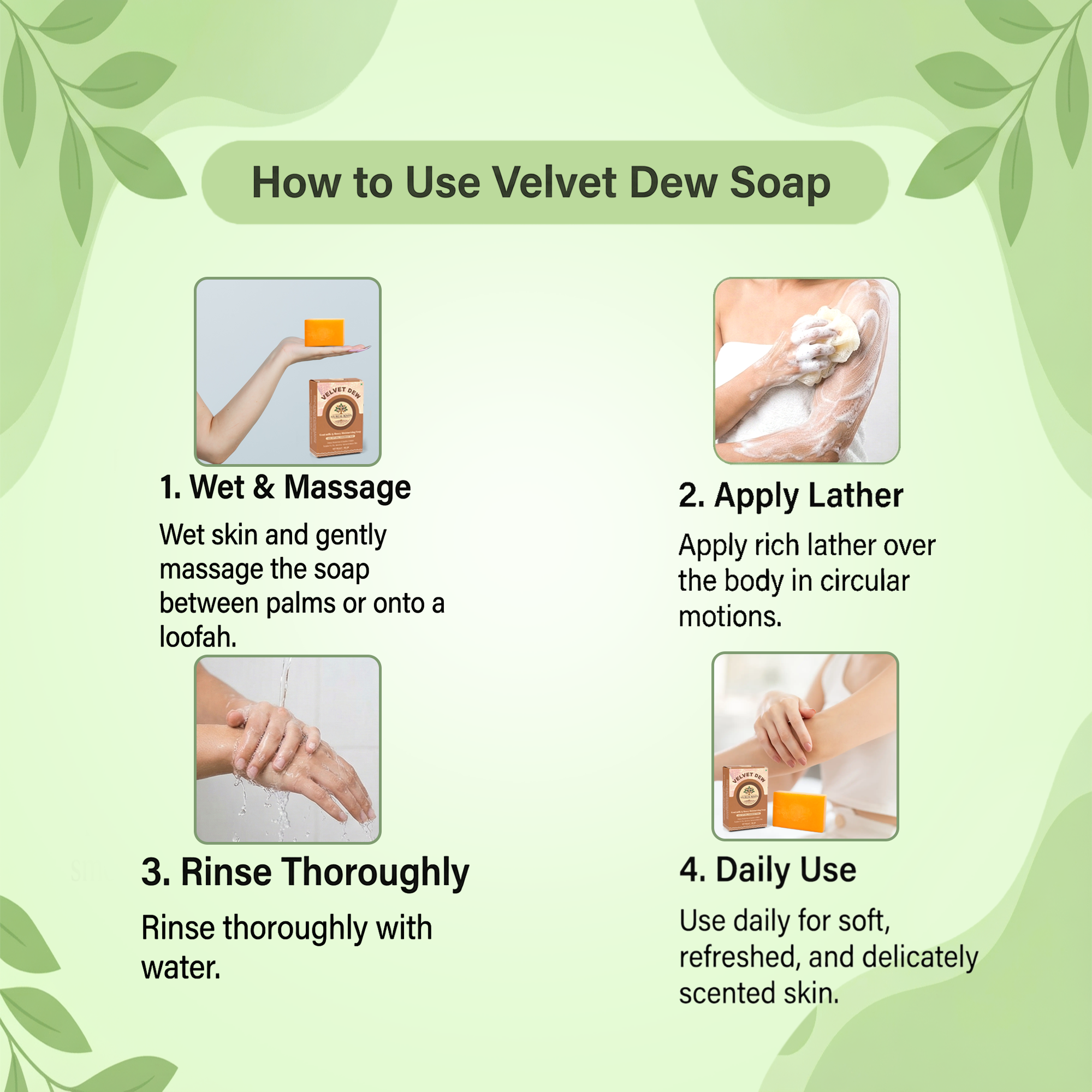 1. Wet skin and gently massage the soap between palms or onto a loofah.